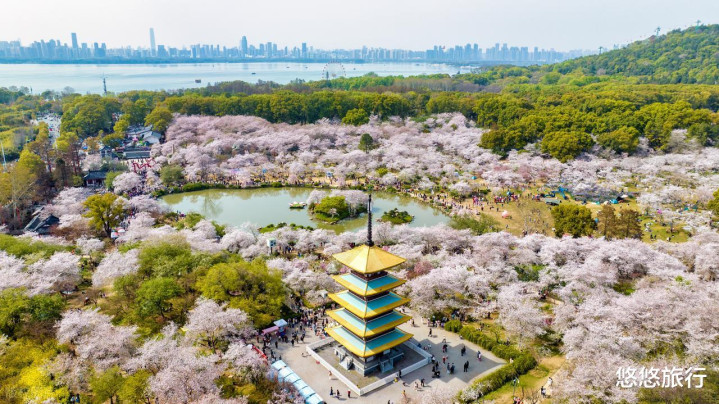 “太湖绝佳处,毕竟在鼋头”,无锡鼋头渚是寰宇三大赏樱地之一,3万株樱花绽放如粉色云霞,搭配江南园林的婉约,肆意格外。