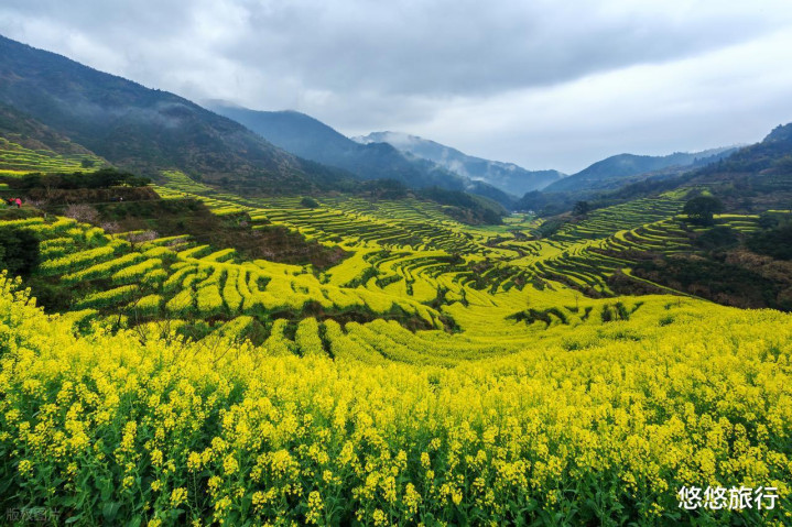 江岭晨雾裹着白墙黛瓦,篁岭二期峻岭梯田花期更长。