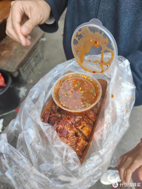 然后是加料,这个脆皮大烧,旧年在昆明菜市集也买过了吃,或者算是傣族的菜系,给的蘸料有点像是撒撇,酸辣为主,大烧部分有点像咱们这边的烧猪,即是用的腌料可能不同样。然后乌鸡的话,嗅觉不合适我的口味,偏淡,肉质比拟柴,猪皮就莫得试了。