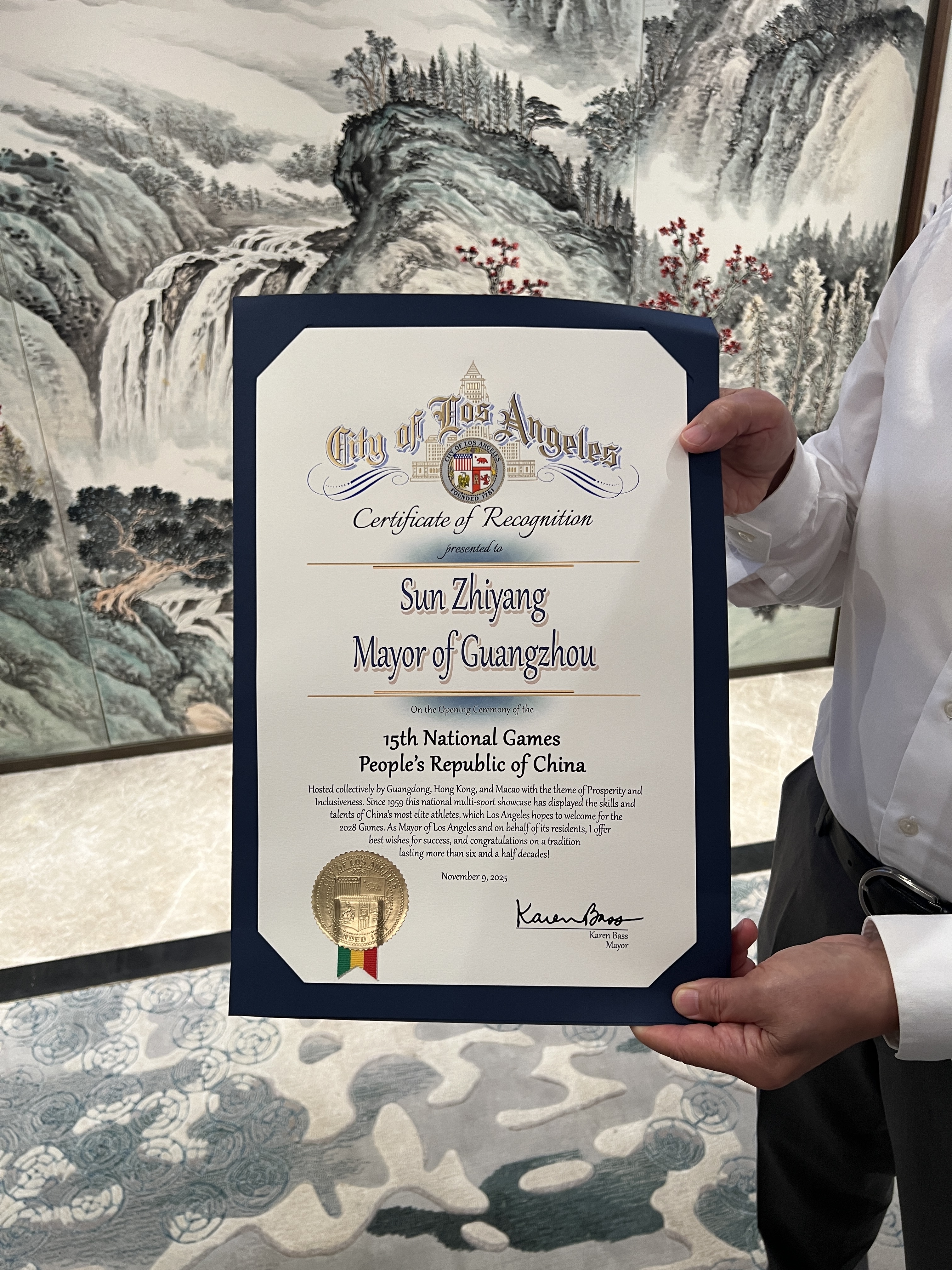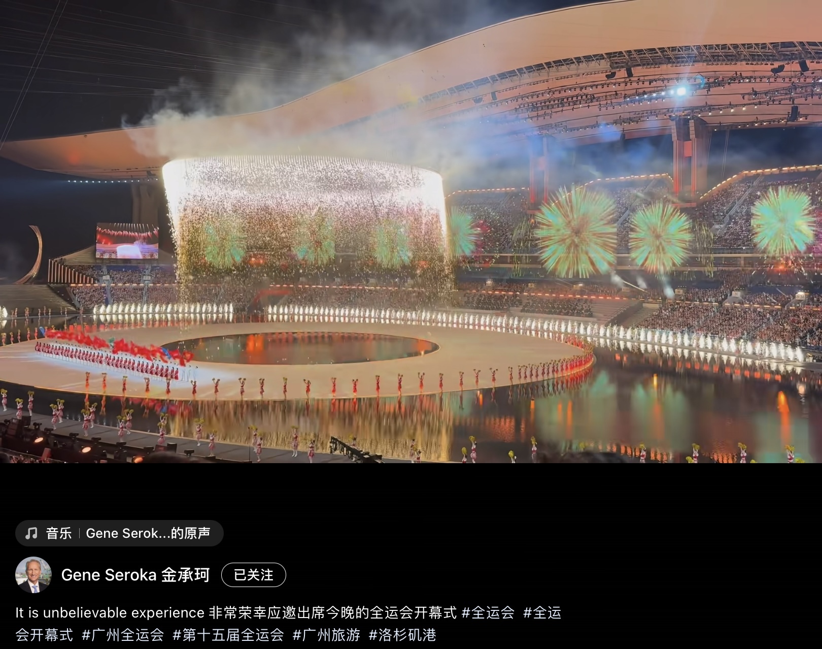 洛杉矶一广州友好城市协会集会会长康永华(Frederick Hong)与洛杉矶港实行董事尤金·塞罗卡(Eugene Seroka)合资从洛杉矶前来广州,不雅看十五运会开幕式。
