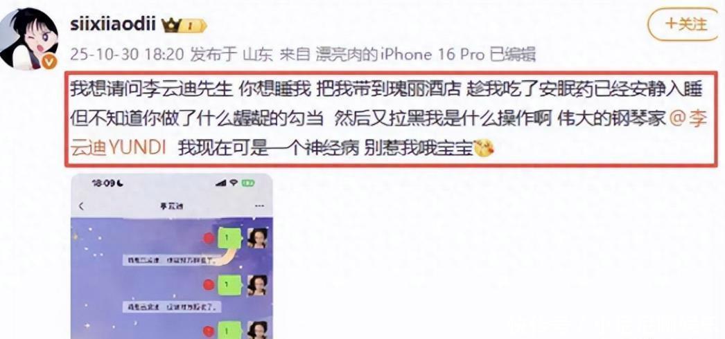 就在10月30日,一位名为司晓迪着名“捞女网红”,陡然发文对李云迪的风致进行了控诉。
