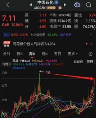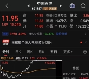 A股“盘子”最大的中国石油在高开之后,逐渐走高,午后封住涨停,终了收盘中国石油报11.95元/股,大涨10%,A股市值达到1.93万亿。而中国石化走势相对最弱,在尾盘聚会竞价时段才封住涨停,终了收盘报7.11元/股,飞腾10%,A股市值6737亿元。