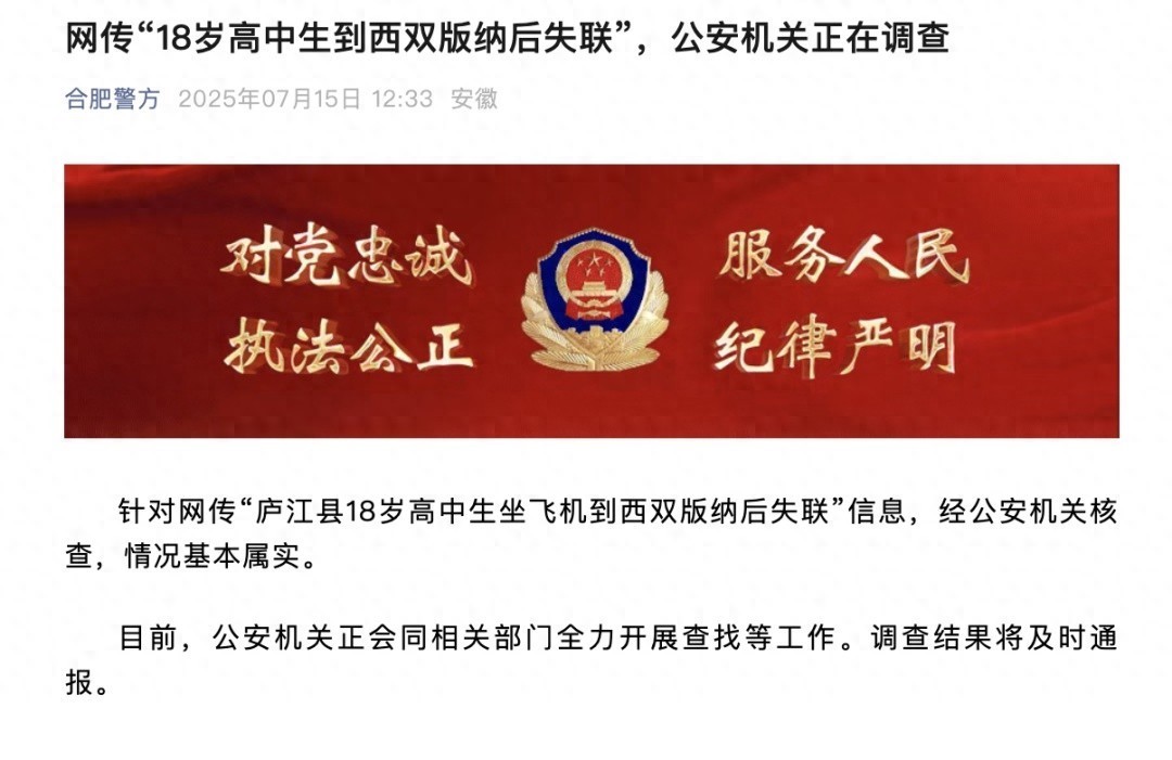 据“合肥警方”微信公众号7月15日音书,针对网传“庐江县18岁高中生坐飞机到西双版纳后失联”信息,经公安机关核查,情况基本属实。