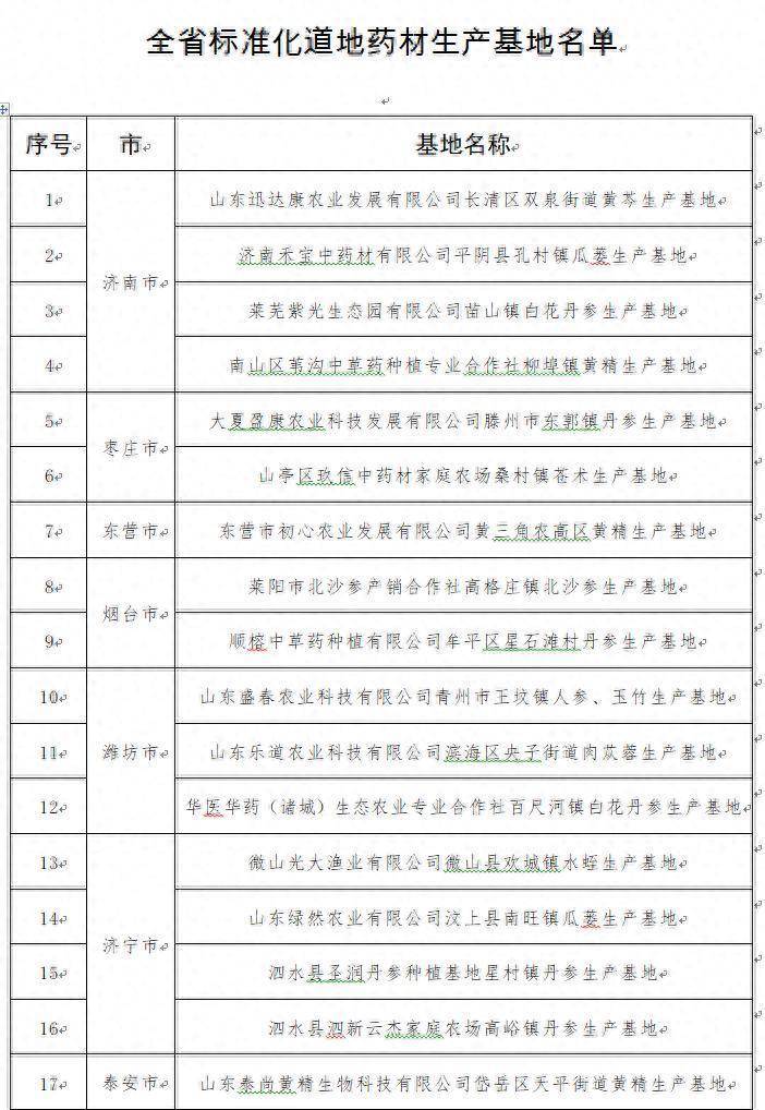 为贯彻落实省政府部署条目,加速诞生一批生态环境致密、出产科罚设施、示范带动才能强的圭臬化说念地药材出产基地,引颈带动全省中药材圭臬化出产水平不停进步,阐发《山东省中药材圭臬化出产基地诞生技艺重点》,经主体请问、县级初审、市级推选、省级实地熟悉和审核,信服山东迅达康农业发展有限公司长清区双泉街说念黄芩出产基地等34家基地为全省圭臬化说念地药材出产基地。