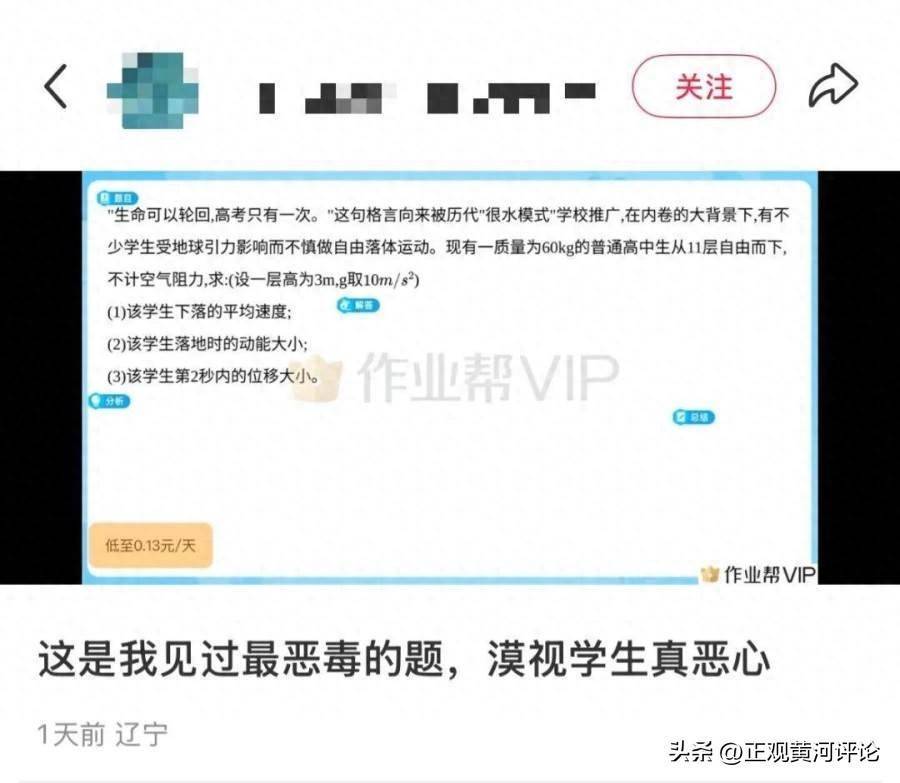 且不论其物理学问点是否正确,单是戏谑地用学生跳楼出题,就已超出教养底线。这不是出题模范的问题,而是价值不雅的误会。用人命悲催作题目素材,不是幽默,是恶原理;不是创意,是冒犯。